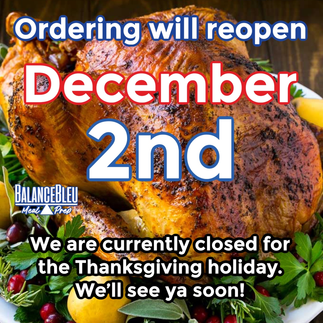 We are currently closed for Thanksgiving! Ordering for BalanceBleu meals will reopen on December 2, 2025 at 12:00pm Tuesday until 11:59pm Thursday for Delivery the following Sunday or pickup on Sunday/Monday. Stay BALANCED y’all!